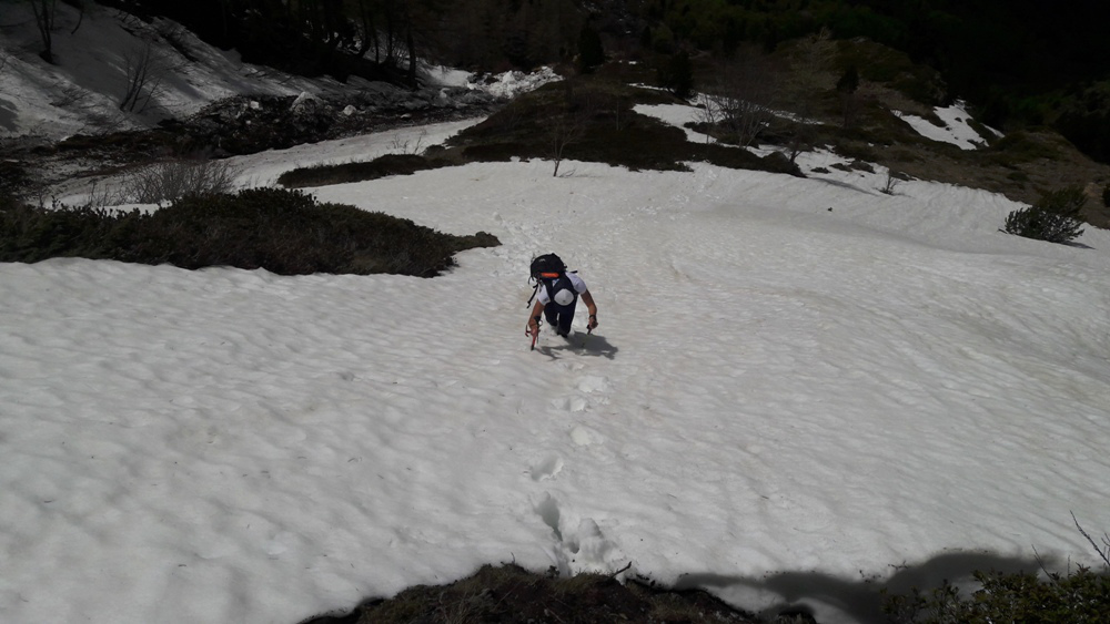 la neige très abondante, nous sommes montés droit dans la pente avec les piolets, en suivant plus ou