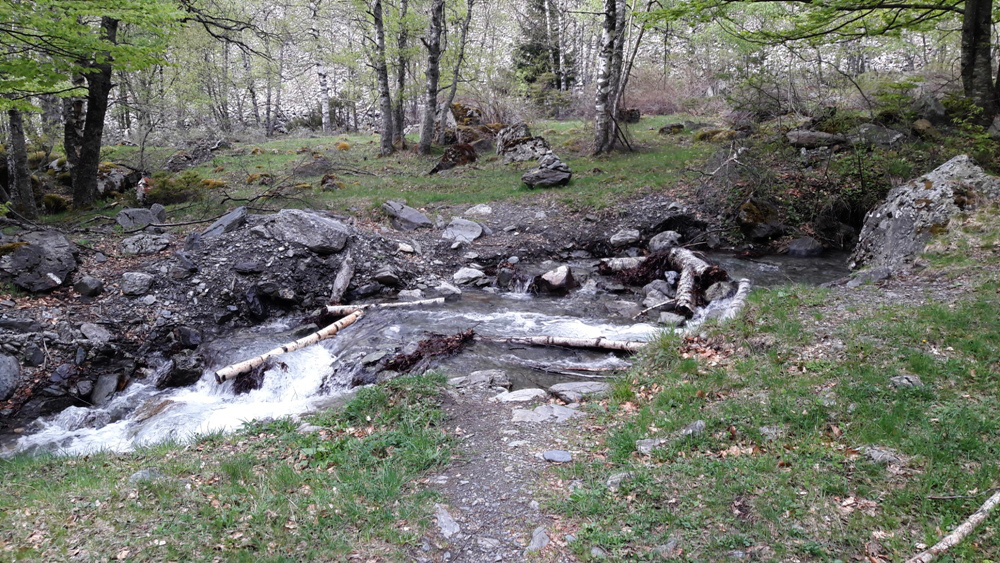 Le chemin derrière le Refuge du Rivobruenti.Traversée de l'un des torrents, après le Refuge du Rivobruenti.Montée dans la forêt, après le Refuge du Rivobruenti.Traversée d'une "clairière", après le Refuge du Rivobruenti.