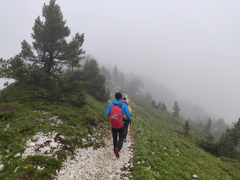 gauche) pour passer au sommet.Arrivée au sommet Nord (1933 m) du Mont Granier, dans les nuages. Le sommet Sud, bien moins fréquenté,