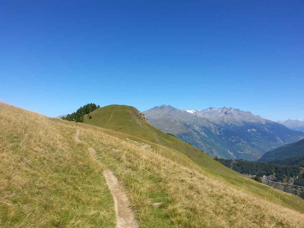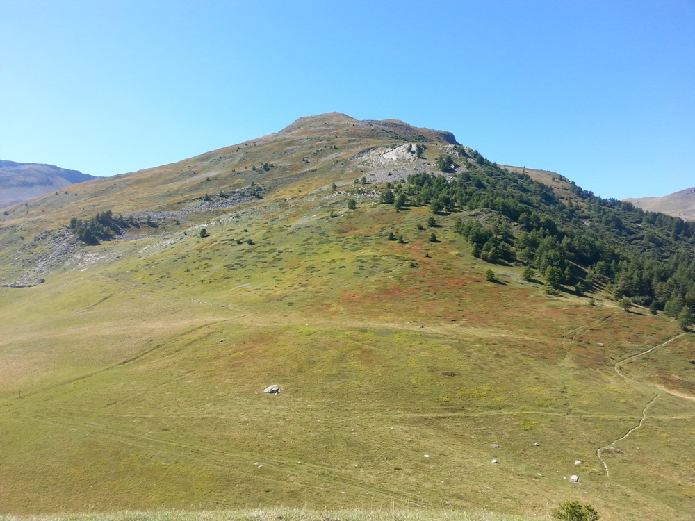précédemment. Le chemin passe d'abord par une prairie alpine puis traverse une petite forêt de conifères juste avant de traverser