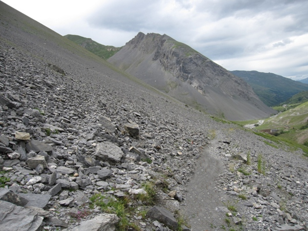 le Plan d'Orient.De l'autre côté du Col des Rochilles, le Camp des Rochilles. Sur la droite dans le pierrier, on devine le chemin