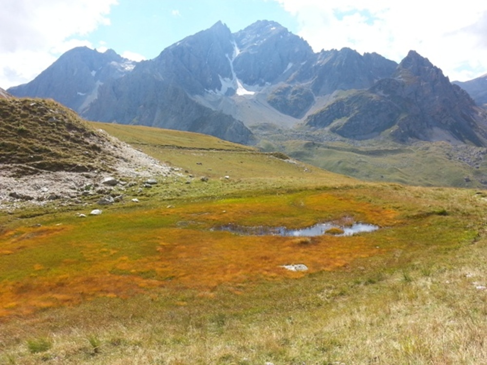 Vue sur le Lac Rond en direction de la vallée de Névache.Vue sur le Lac du Grand Ban et rejoignant le gros chemin du bord des lacs. On voit le Col des Cerces à droite et