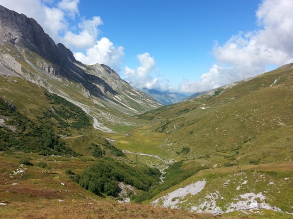 Le lac est au-dessus de la barre rocheuse au premier plan à gauche de la photo.Vue sur la vallée de l'Aiguille Noire en direction de Valloire.