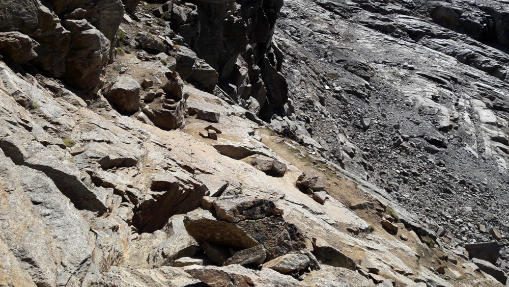 rocheux.Retour en haut du passage vertical. En bas on voit bien la moraine avec le chemin qui passe dessus.