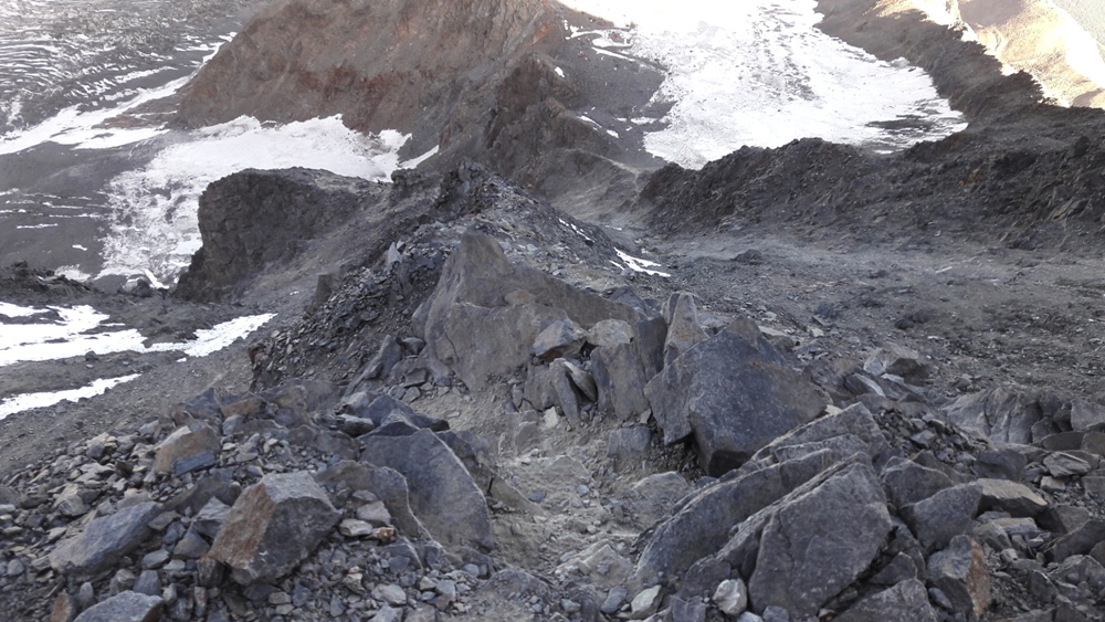Redescente sur l'ancien Refuge du Goûter.Début de la redescente de l'arête du Goûter, devant l'ancien Refuge du Goûter. Au fond,