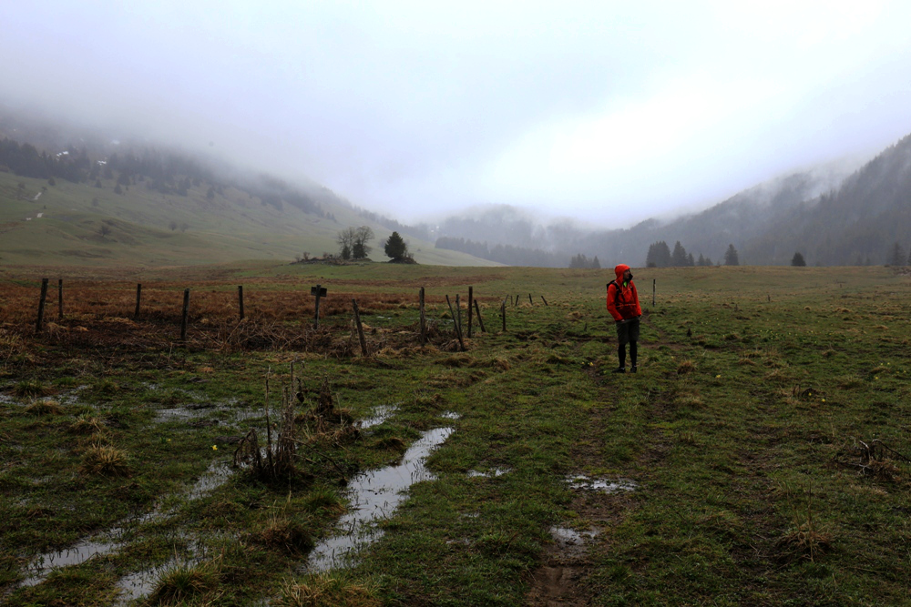 Plateau. A cet endroit, il faut prendre la piste qui descend sur la gauche, en direction du petit torrent