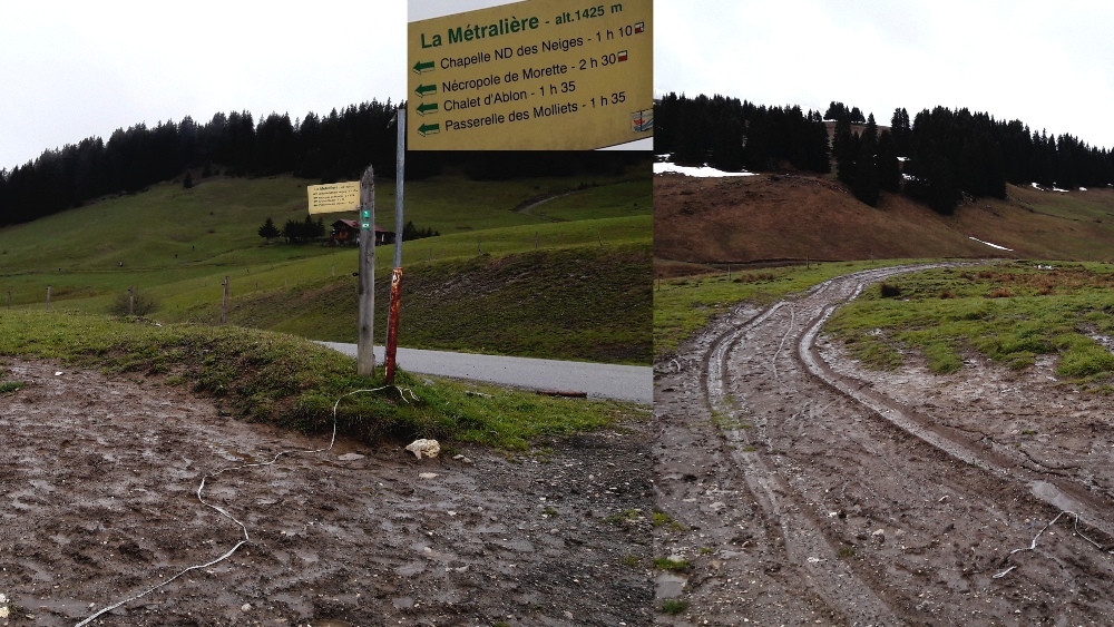 piste qui descend sur la gauche de la route au niveau de la Métralière.Arrivée à Paccot. Dans l'ordre de lecture : le carrefour devant le bâtiment de Paccot,