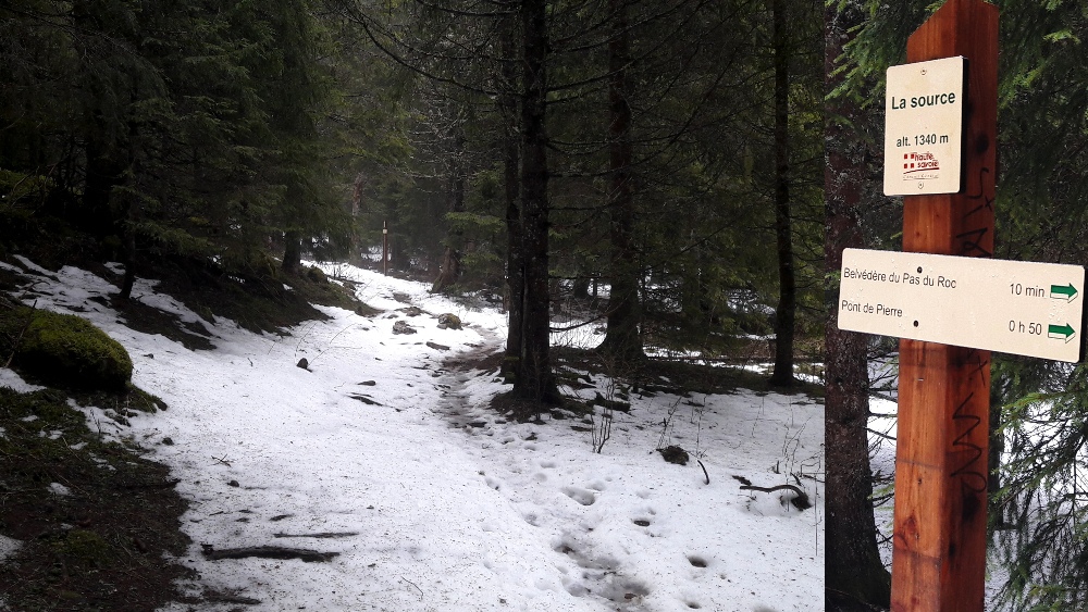 le Pont de Pierre.Début de la montée vers le sentier aérien du Pas du Roc, dans la forêt de feuillus.Suite de la montée vers le sentier aérien du Pas du Roc, dans la forêt de conifères.Arrivée au début du chemin aérien du Pas du Roc.