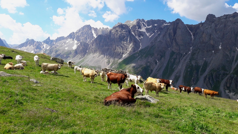 Les ruines de Mont Jovet, avec plein de vaches.Dans l'ordre de lecture : le chemin qui monte droit dans la pente (juste après les ruines de