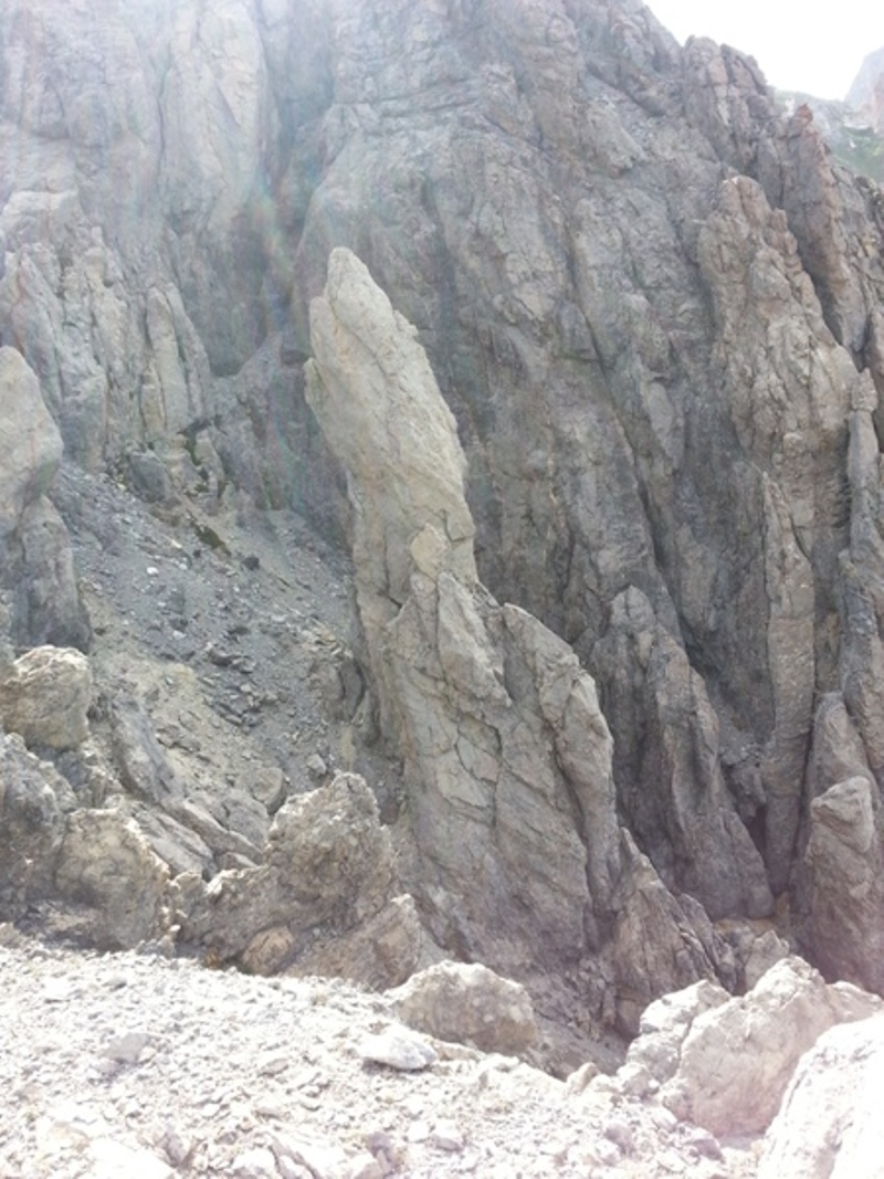 La descente s'effectue par un immense pierrier qui est plutôt stable. Le chemin le traverse de façon nette et il n'y a aucun risque