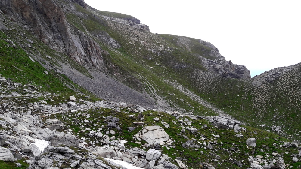 l'autre côté du lac (celle avec la plaque de neige).Derrière la butte, après le lac. Le couloir herbeux commence au col au centre de la photo,