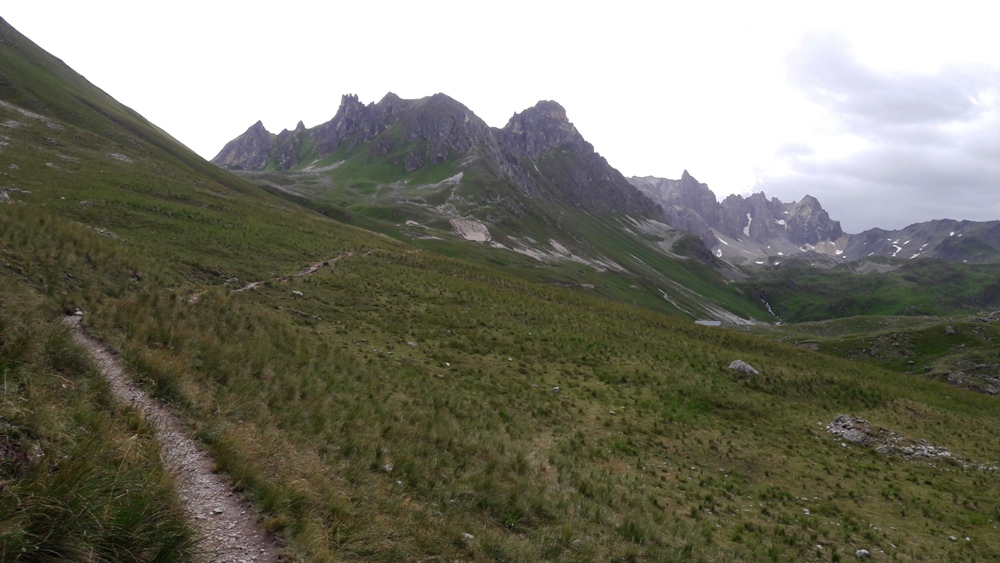 l'Aiguille Noire en direction de Valloire, avant de quitter le chemin pour remonter un couloir herbeux