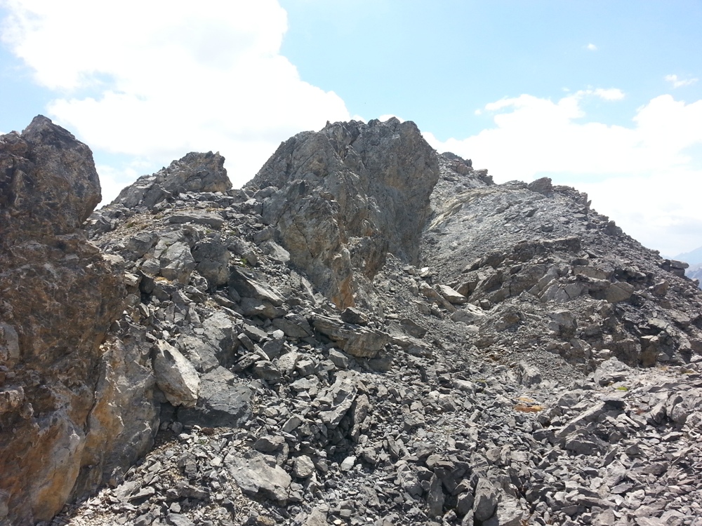Vue vers le bas après avoir passé la brèche et être monté sur la barre rocheuse.Vue sur le sommet après avoir passé la brèche.Arrivée au sommet.Le poteau clouté sommital.